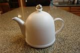 K7790, Ceramic teapot with insulated white cozy. Holds 3 cups but most people fill with 2 cups of hot water for safe handling. Ceramic teapot and lid. The cozy is made of a durable high density white plastic with a flannel felt lining to keep your tea warm. Unlike cloth cozies you can pour more tea without taking it off. 8.5 inches across to tip of spout. 6 inches high with cozy on. (4.5 inches high without cozy) 5.3 inch base diameter. The teapot is well balanced and elegant. ...